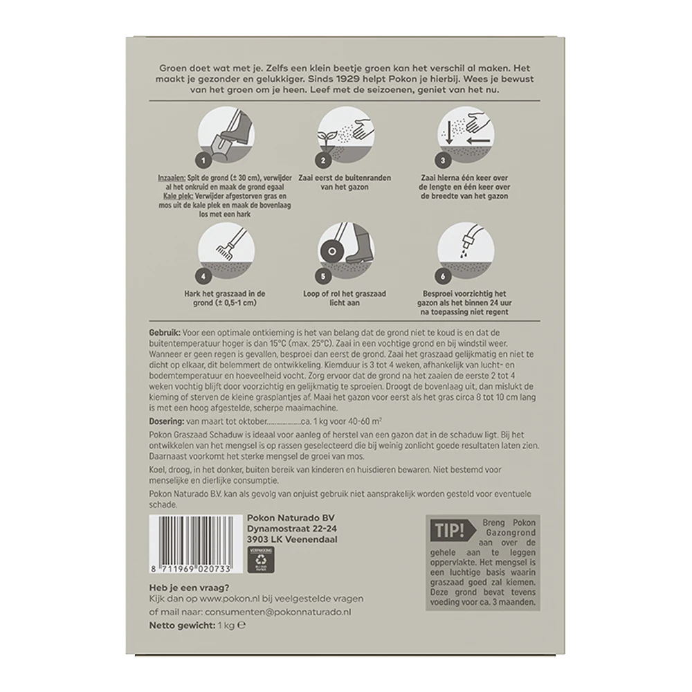 Pokon Graszaad Schaduw is ideaal voor aanleg of herstel van een gazon dat in de schaduw ligt. Bij het ontwikkelen van het mengsel is op rassen geselecteerd die bij weinig zonlicht goede resultaten laten zien. Daarnaast voorkomt het sterke mengsel de groei van mos. Voor een optimale kieming is het van belang dat de grond niet te koud is en dat de buitentemperatuur hoger is dan 15°C (max. 25°C). Zaai in een vochtige grond en bij windstil weer. Wanneer er geen regen is gevallen, besproei dan eerst de grond. Zaai het graszaad gelijkmatig en niet te dicht op elkaar, dit belemmert de ontwikkeling. Kiemduur is 3 tot 4 weken, afhankelijk van lucht- en bodemtemperatuur en hoeveelheid vocht. Zorg ervoor dat de grond na het zaaien de eerste 2 tot 4 weken vochtig blijft door voorzichtig en gelijkmatig te sproeien. Droogt de bovenlaag uit, dan mislukt de kieming of sterven de kleine grasplantjes af. Maai het gazon voor het eerst als het gras circa 8 tot 10 cm lang is met een hoog afgestelde, scherpe maaimachine.