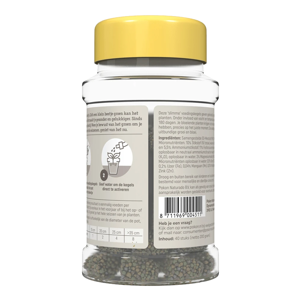| Dosis | Ø pot 15cm: 1 voedingskegel; Ø pot 20cm: 2 voedingskegels; Ø pot 25cm: 4 voedingskegels; Ø pot > 35cm: 8 voedingskegels. |
